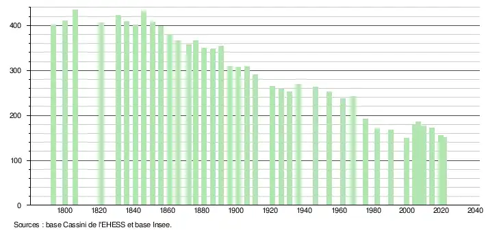 L'évolution du nombre d'habitants est connue à travers les recensements de la population effectués dans la commune depuis 1793. Pour les communes de moins de 10 000 habitants, une enquête de recensement portant sur toute la population est réalisée tous les cinq ans, les populations légales des années intermédiaires étant quant à elles estimées par interpolation ou extrapolation[21]. Pour la commune, le premier recensement exhaustif entrant dans le cadre du nouveau dispositif a été réalisé en 2004[22].