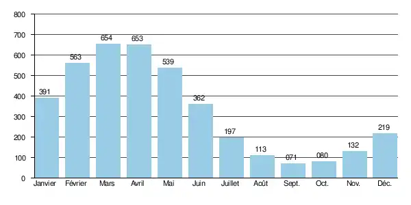 Les crues sont fort peu importantes, même compte tenu de la taille très modeste du bassin. Les QIX 2 et QIX 5 valent en effet respectivement 0,72 et 1,2 m3/s. Le QIX 10 est de 1,5 m3/s, le QIX 20 de 1,7 m3/s. Quant au QIX 50, il se monte à 2,1 m3/s.