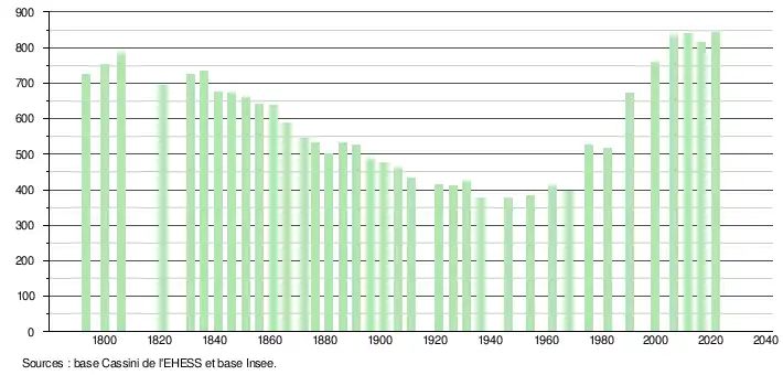 L'évolution du nombre d'habitants est connue à travers les recensements de la population effectués dans la commune depuis 1793. Pour les communes de moins de 10 000 habitants, une enquête de recensement portant sur toute la population est réalisée tous les cinq ans, les populations légales des années intermédiaires étant quant à elles estimées par interpolation ou extrapolation[26]. Pour la commune, le premier recensement exhaustif entrant dans le cadre du nouveau dispositif a été réalisé en 2006[27].