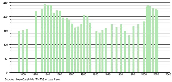 L'évolution du nombre d'habitants est connue à travers les recensements de la population effectués dans la commune depuis 1793. Pour les communes de moins de 10 000 habitants, une enquête de recensement portant sur toute la population est réalisée tous les cinq ans, les populations légales des années intermédiaires étant quant à elles estimées par interpolation ou extrapolation[36]. Pour la commune, le premier recensement exhaustif entrant dans le cadre du nouveau dispositif a été réalisé en 2004[37].
