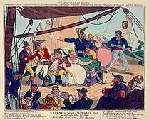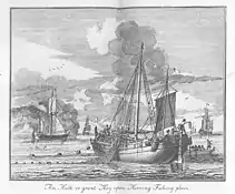 Le navire au premier plan à gauche est un heu (Envoi de Woolwich, Thomas Mellish, 1748, musée maritime national).