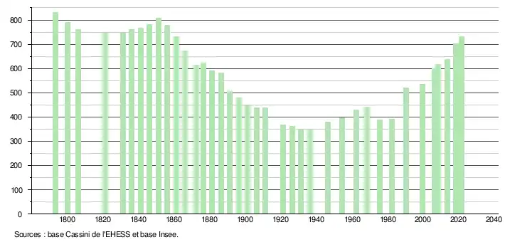 L'évolution du nombre d'habitants est connue à travers les recensements de la population effectués dans la commune depuis 1793. Pour les communes de moins de 10 000 habitants, une enquête de recensement portant sur toute la population est réalisée tous les cinq ans, les populations légales des années intermédiaires étant quant à elles estimées par interpolation ou extrapolation[21]. Pour la commune, le premier recensement exhaustif entrant dans le cadre du nouveau dispositif a été réalisé en 2008[22].