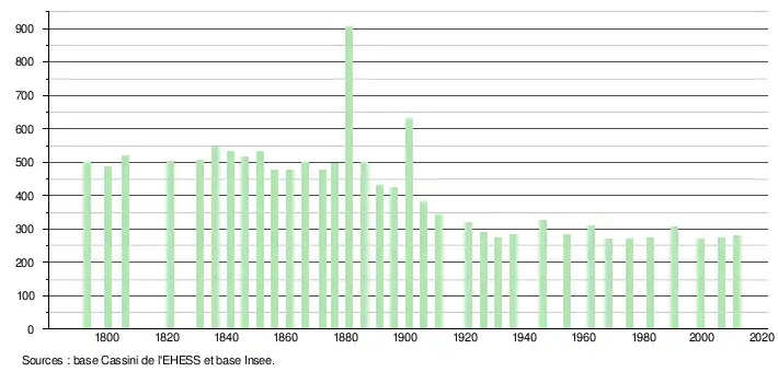 L'évolution du nombre d'habitants est connue à travers les recensements de la population effectués dans la commune depuis 1793. À partir du , les populations légales des communes sont publiées annuellement dans le cadre d'un recensement qui repose désormais sur une collecte d'information annuelle, concernant successivement tous les territoires communaux au cours d'une période de cinq ans. Pour les communes de moins de 10 000 habitants, une enquête de recensement portant sur toute la population est réalisée tous les cinq ans, les populations légales des années intermédiaires étant quant à elles estimées par interpolation ou extrapolation[4]. Pour la commune, le premier recensement exhaustif entrant dans le cadre du nouveau dispositif a été réalisé en 2006[5],[Note 1].