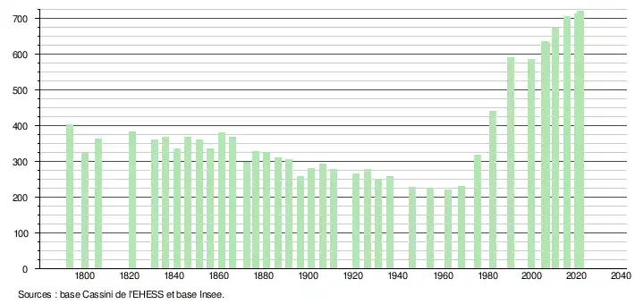 L'évolution du nombre d'habitants est connue à travers les recensements de la population effectués dans la commune depuis 1793. Pour les communes de moins de 10 000 habitants, une enquête de recensement portant sur toute la population est réalisée tous les cinq ans, les populations légales des années intermédiaires étant quant à elles estimées par interpolation ou extrapolation[21]. Pour la commune, le premier recensement exhaustif entrant dans le cadre du nouveau dispositif a été réalisé en 2005[22].
