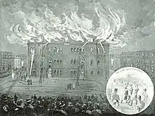 En 1890, le bâtiment de l'école situé sur les rues Peel et Metcalfe brûle[41], probablement un incendie criminel, mais la cause de l'incendie n'a jamais été déterminée. Une nouvelle école, construite sur le même site, est ouverte en 1892[29]. Entre-temps, les classes sont réparties entre les écoles des rues Metcalfe et Berthelet et l'Institut Fraser. Le nouveau bâtiment de la rue Peel comptait trente-deux salles de classe, celles de l'aile sud pour les filles et celles de l'aile nord pour les garçons. Les couloirs des ailes menaient à un cœur administratif situé au centre, avec des portes surmontées de pointes de fer pour séparer les filles des garçons[42]. Le site du 1455 rue Peel a ensuite été occupé par l'hôtel Mont-Royal[43], qui est devenu dans les années 1980 le centre commercial Cours Mont-Royal.