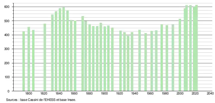 L'évolution du nombre d'habitants est connue à travers les recensements de la population effectués dans la commune depuis 1793. Pour les communes de moins de 10 000 habitants, une enquête de recensement portant sur toute la population est réalisée tous les cinq ans, les populations légales des années intermédiaires étant quant à elles estimées par interpolation ou extrapolation[18]. Pour la commune, le premier recensement exhaustif entrant dans le cadre du nouveau dispositif a été réalisé en 2008[19].