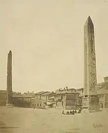 - l'obélisque de Théodose, érigé d'abord par le pharaon Thoutmôsis III au sud du VIIe pylône du grand temple de Karnak en Égypte, transporté à Alexandrie sous Constance II (empereur de 337 à 361), puis enfin à Constantinople sous le règne de Théodose Ier (empereur de 379 à 395) où il fut réérigé en 390 dans l'hippodrome[5].