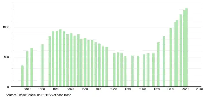 L'évolution du nombre d'habitants est connue à travers les recensements de la population effectués dans la commune depuis 1793. Pour les communes de moins de 10 000 habitants, une enquête de recensement portant sur toute la population est réalisée tous les cinq ans, les populations légales des années intermédiaires étant quant à elles estimées par interpolation ou extrapolation[35]. Pour la commune, le premier recensement exhaustif entrant dans le cadre du nouveau dispositif a été réalisé en 2008[36].
