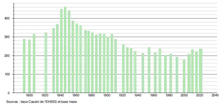 | L'évolution du nombre d'habitants est connue à travers les recensements de la population effectués dans la commune depuis 1793. Pour les communes de moins de 10 000 habitants, une enquête de recensement portant sur toute la population est réalisée tous les cinq ans, les populations légales des années intermédiaires étant quant à elles estimées par interpolation ou extrapolation[37]. Pour la commune, le premier recensement exhaustif entrant dans le cadre du nouveau dispositif a été réalisé en 2005[38]. En 2021, la commune comptait 236 habitants[Note 7], en augmentation de 5,83 % par rapport à 2015 (Haute-Garonne : +7,43 %, France hors Mayotte : +1,84 %). |