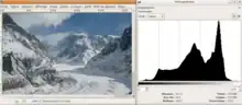 Une image et son histogramme, avec le pic correspondant au blanc (neige et nuages).