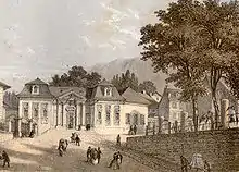 C’est au duc de Chablais, fils du roi Victor Amédée III, qu’Aix doit sa renaissance, car c’est lui qui après avoir goûté au bienfait des sources et s’y être trouvé mal logé, suggéra au roi, la construction d’un établissement thermal. Par billet royal du le roi Victor Amédée III chargea le comte de Robiland de dresser les plans d’un établissement de bains. Celui-ci fut construit de 1779 à 1783 sous la direction de l’ingénieur Capellini[12]. Cette date marque aussi le début de la démolition de l’ancien centre-ville, car à la suite de cette construction imposante, on commença à dégager les alentours des maisons pour créer une place.