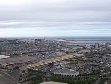 Parallèlement à l’essor économique, les Trente Glorieuses voient le développement urbain de Cherbourg. La ville doit faire à une crise du logement due au boum démographique. En effet, un rapport de 1954 évalue à 1 000 le nombre de familles vivant dans des taudis, et réclame 1 500 logements. Sortent alors de terre la cité du Casino en 1957 et la cité Fougère en 1958, puis en 1959 l’ensemble de l’Amont-Quentin, de Charcot-Spanel et la cité Chantereyne qui doit accueillir les familles des ingénieurs et officiers travaillant à l’arsenal[52]. Le port Chantereyne gagné sur la mer, la place Divette et le boulevard Schuman créés à l’emplacement des anciens champs de foire modifient la physionomie de la ville, alors que les autres villes de l’agglomération se densifient.