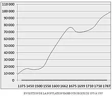 Néanmoins, à cette date, la population stagne, voire recule à 70 000 habitants à cause de la peste et des risques de guerre. Du XIIIe siècle au XIXe siècle, la population de Hambourg augmente surtout grâce à l’immigration hollandaise. Les immigrés juifs portugais (sépharades) ou allemands (ashkénazes) jouent un rôle de plus en plus important. Les huguenots français vont aussi à Hambourg à la fin du XVIIe siècle, sans pour autant jouer un rôle majeur. La ville attire huguenots et Juifs, car elle est officiellement réformée, en partie ouverte aux autres religions, et profondément marchande.