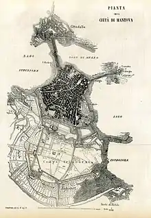 Mantoue, qui n'a plus d'importance d'un point de vue stratégique et militaire, subit de nombreuses démolitions. Pendant les années de la monarchie et du fascisme, la Porta Cerese, la Porta Pusterla, la Porta Mulina, la Porta Pradella (en 1940) et les murs le long de l'actuelle viale Risorgimento sont démolis et le fossé Magistrale parallèle est enterré, permettant l'expansion vers le sud. Le centre historique est également touché par d'importantes transformations urbaines. La Palazzina della Paleologa qui se trouvait devant le château Saint-Georges et le passage surélevé qui reliait le palais ducal de Mantoue à la cathédrale San Pietro de Mantoue sont démolis. Les démolitions dans le ghetto juif sont suivies de la construction des bâtiments de la Chambre de commerce, de la Banque d'Italie et du Palazzo Gallico ; la rotonde San Lorenzo est retrouvée et restaurée. L'expansion urbaine s'accompagne à partir de 1901 de l'agrégation de portions du territoire des communes voisines, en commençant avec le hameau de Te, propriété de la commune de Virgilio[16]. En 1906, une partie du territoire de la commune de Curtatone est détachée[17]. En même temps, dans les premières décennies du XXe siècle, le terrain domanial où se trouvait la lunetta di Pompilio, est cédé à l'administration municipale qui, après avoir démoli le bâtiment militaire, commence en 1912, les travaux de construction de l'hôpital qui est nommé d'après Carlo Poma, le docteur martyr de Belfiore. La création d'une première ligne de tramway de la gare à Porta Mulina en passant par le centre-ville, est signe de progrès. En septembre 1914, deux nouvelles lignes sont inaugurées, toutes deux commençant Piazza Purgo (aujourd'hui Marconi) et se terminant aux historiques Porta Pusterla et Porta Cerese. Le service de tramway urbain est interrompu dès 1932. Mantoue, malgré l'expansion territoriale, avec ses 29 142 habitants, n'est guère plus qu'une ville qui, ayant peu d'activités industrielles, vit de la richesse produite à la campagne où l'agriculture est déjà au premier plan.