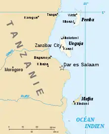 L'arrivée des navigateurs portugais dans l'océan Indien met fin à cette prospérité économique lorsqu'ils s'établissent sur la côte orientale de l'Afrique et s'implantent dans le sultanat d'Oman en y instaurant un protectorat. Parmi les différents explorateurs, Vasco de Gama joue un rôle non négligeable dans l'implantation portugaise dans la région en s'arrêtant dans différents ports, prenant contact avec les souverains locaux et liant des rapports amicaux avec certains d'entre eux de 1497 à 1499. Les Portugais, comprenant vite l'intérêt stratégique de la création de comptoirs le long de la côte est-africaine, s'installent sur les îles de Pemba et d'Unguja, prenant par la force le contrôle de cette dernière en 1503, puis à Mombasa en 1505[4]. Le roi swahili de l'île, portant le titre de « Mwinyi Mkuu », est alors contraint de devenir citoyen portugais et d'autoriser le libre accès du port aux navires étrangers. S'implantant peu à peu sur la quasi-totalité de la côte occidentale de l'océan Indien, les portugais s'approprient par la même occasion le contrôle des routes commerciales de cette région, les détournant afin de les diriger vers le Portugal. Cette présence colonisatrice est à l'origine de la ville de Zanzibar avec la construction en 1590 d'une église à l'emplacement du quartier de Stone Town.