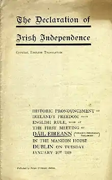En 1916, sous la direction de l'Irish Republican Brotherhood, du Sinn Féin et de l'Irish Citizen Army de James Conolly, éclate l'insurrection de Pâques 1916 à Dublin, qui proclame la République au nom de Dieu et des générations disparues. Le centre de Dublin est bombardé par des navires de guerre et l'insurrection est écrasée au bout d'une semaine. James Conolly, Patrick Pearse et les autres meneurs sont passés par les armes, mais le Sinn Féin en retire une popularité accrue : il remporte triomphalement les élections de décembre 1918, constitue un parlement irlandais (le Dáil Éireann) et proclame l'indépendance. Le pouvoir britannique dissout le parlement. Un nouveau soulèvement éclate, qui dure trois ans.