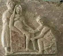 Il existe des sages-femmes (obstetrix) et des médecins gynécologues-accoucheuses (medica ou iatromea)[3]. Ce sont deux fonctions très valorisées. Les premières sont chargées des cas simples, ne semblant pas devoir présenter de complications. Un médecin est appelé à l'aide en cas de problème. L'un d'eux eux, nommé Soranos, est réputé pour maîtriser deux pratiques : la version podalique, qui consiste à modifier la position d'un enfant qui se présente mal pour qu'il se présente par les pieds, et l'avortement tardif, si l'enfant n'arrive pas à sortir. Le fœtus est alors sacrifié pour sauver la vie de la mère : un cranioclaste peut être alors utilisé pour pratiquer une cranioclasie (écrasement du crâne), et un embryotome sert à découper le corps du fœtus in utero ; les morceaux sont enlevés au fur et à mesure avec un crochet. Cette technique essaime à travers l'Europe, et un cadavre de fœtus traité de la sorte aurait été retrouvé en Angleterre au IVe siècle. Le matériel d'accouchement se compose de deux lits, l'un réservé à la phase de travail, le second à la phase de repos après l'accouchement, tandis que l'expulsion se fait sur une sorte de chaise percée à dossier droit et munie de poignées. La sage-femme assiste à l'expulsion par le trou de la chaise. Les forceps sont alors inconnus, et l'accouchement redouté en raison du risque de mortalité élevé[4].