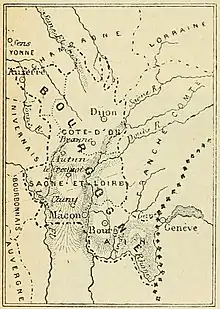 Profitant de la faiblesse de l'Empire, ce peuple se construit, à partir de la seconde moitié du Ve siècle, un vaste et puissant royaume qui, à son apogée, touche au nord la ligne des Vosges et la Durance au midi. D’orient en occident, le royaume burgonde s'étend de l’Aar à la Saône et de la Vallée d'Aoste à la Haute-Loire[7]. Sur le territoire des futurs duché et comté de Bourgogne, les cités d'Auxerre, Langres, Besançon, Chalon-sur-Saône et Autun figurent dans ses possessions.