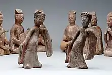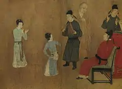 Les représentations musicales à la cour Tang sont de deux types : les représentations assises (坐部伎) et les représentations debout (立部伎)[45]. Les représentations assises sont menées dans des salles plus petites avec un nombre limité de danseurs et mettent l'accent sur un art raffiné. Les représentations debout comportent de nombreux danseurs et sont généralement exécutées dans des cours ou des places destinées à de grandes présentations.