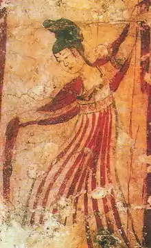 Une célèbre danseuse de la dynastie Han est Zhao Feiyan, une grande beauté qui devient impératrice après sa jeunesse modeste. Elle est nommée Feiyan ou « Hirondelle volante » d'après sa silhouette élancée et ses pas de danse souples, si légers qu'elle semble trembler comme une fleur dans la main[29],[30]. Les danseurs professionnels de l'époque sont de statut social inférieur et beaucoup entrent dans la profession par la pauvreté, bien que certains comme Zhao Feiyan atteignent un statut plus élevé en devenant des concubines. Une autre danseuse était Wang Wengxu (王翁須) qui est contrainte de devenir une domestique chanteuse-danseuse mais qui plus tard enfante le futur empereur Xuan de Han.