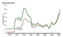 L'ensemble de ces événements, auquel s'ajoutera une gestion parfois incohérente de la crise (le président Carter décrétera un embargo sur le pétrole iranien, Opération Eagle Claw, inflation délibérée), conduira au deuxième choc pétrolier. L'augmentation en flèche du prix du baril accompagnée d'un fléchissement du PIB mondial suscite énormément de préoccupations à l'échelle internationale. Dans la pagaille, le Canada coupera même sa fourniture de pétrole à son puissant voisin[40]. Pour la première fois de son histoire, l'OCDE craint de manquer de pétrole. Et pour la première fois, les pays producteurs ont l'impression de contrôler le marché. Toujours en 1980, l'Arabie saoudite achève le rachat des actions d'Aramco.