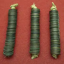 Comme les pièces de monnaie chinoises ne sont pas en nombre suffisant alors que le commerce et l'économie se développent, des imitations locales japonaises de pièces chinoises sont frappées à partir du XIVe siècle, en particulier des imitations de pièces Ming, avec des noms inscrits identiques à ceux des pièces chinoises contemporaines[2]. Ces pièces sont considérées comme très faibles par rapport à la valeur des pièces de monnaie chinoises et plusieurs d'entre elles doivent être échangées pour une seule pièce de monnaie chinoise. Cette situation perdure jusqu'au début de l'époque d'Edo lorsqu'un nouveau système est mis en place.