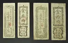Les Yamada Hagaki, premiers billets du Japon, sont émis vers 1600 par des prêtres shinto travaillant aussi comme marchands au Ise-yamada (moderne préfecture de Mie), en échange d'argent[2]. Cette émission est antérieure aux premiers billets d'orfèvres émis en Angleterre vers 1640[2]. Le premier billet connu de l'ère féodale japonaise est émis par le clan Fukui en 1661. Au cours du XVIIe siècle, les domaines féodaux développent un système de billets féodaux, donnant valeur de monnaie aux billets émis par le seigneur du domaine en échange de la convertibilité en or, en argent ou en cuivre[2]. Le Japon combine ainsi les standards en or, en argent et en cuivre avec la circulation de papier monnaie[2].