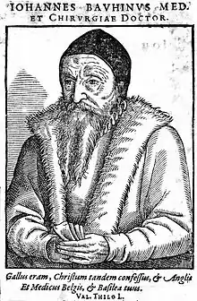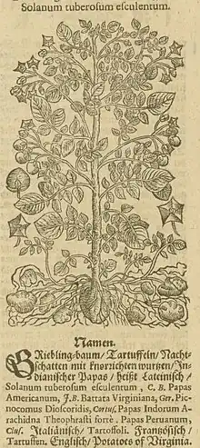 C'est au botaniste bâlois Gaspard Bauhin qu'on doit la première publication en 1596 d'une description botanique[N 6] dans son ouvrage Phytopinax seu Enumeratio plantarum[33] Il la rapproche des Solanum, « en raison de la ressemblance de ses feuilles et de ses fruits avec la Tomate, et de ses fleurs avec l’Aubergine, ainsi que pour sa semence qui est celle des Solanum, et pour son odeur forte qu’elle a de commun avec ces derniers » : il lui attribue le nom de Solanum tuberosum[34]. Il y cite aussi l'appellation italienne du tubercule Tarutffoli. Il étend le nom de laSolanum tuberosum en 1620 dans Prodromos Theatri Botanici[35], puis en 1623 dans Pinax theatri botanici, en Solanum tuberosum esculentum, (Morelle tubéreuse comestible)[36]. Ce nom, repris par la suite et abrégé en Solanum tuberosum selon la nomenclature binomiale par Linné dans son Species Plantarum publié en 1753, est encore aujourd'hui le nom scientifique de l'espèce[37]. Dans son Prodomos, où il propose la première représentation publiée en Europe de la pomme de terre, il écrit qu'on lui aurait rapporté qu'en Bourgogne les tubercules, accusés d'être vecteur de la lèpre[N 7], auraient vu leur usage interdit, ce qui ne sera pas sans conséquences sur l'avenir de la culture de la pomme de terre en France.