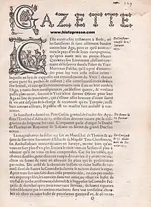 Le premier numéro de la Gazette est publié le , emboîtant ainsi le pas aux Nouvelles ordinaires de divers endroits des libraires parisiens Martin et Vendosme, parues depuis . Soutenu par Richelieu, qui fit de la Gazette un instrument de sa propagande politique, Renaudot emporta ce marché face à ses concurrents, malgré l’hostilité de la communauté des imprimeurs et libraires parisiens. Dès 1632, Renaudot insère dans ses publications et entre deux Gazette, une feuille intitulée Nouvelles Ordinaires, ainsi qu'un mensuel : Relations des Nouvelles du Monde. En 1635, l’État lui accorda un monopole pour lui et ses successeurs[5].