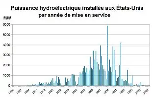 Les États-Unis connaissent après la Seconde Guerre mondiale un boom de la production hydroélectrique: elle passe de 100,9 térawatts-heures en 1950 à 149,4 en 1970, soit une progression de 50 % en une décennie, à laquelle s'ajoute une progression de 67 % lors de la décennie suivante, celle des années 1960, qui se terminent par une production de 251 térawatts-heures en 1970, niveau auquel le pays est revenu en 2010, quarante ans après. Entre-temps, l'équipement du pays a connu des hauts et des bas, avec d'excellentes années et d'autres beaucoup plus médiocres, le choc pétrolier de 1974 et celui de 1980 ayant remis au goût du jour d'autres sources d'énergie.