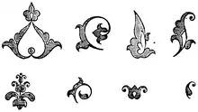 Les fleurons sont régulièrement gravés dans du cuivre, et en relief pour que le motif apparaisse en creux sur le cuir (contrairement à la plupart des fers au Moyen Âge, qui étaient gravés en creux pour un motif apparaissant en relief sur le support)[110]. La « palette », un fer orné et emmanché, de forme légèrement convexe, est inventée à la Renaissance pour permettre au relieur-doreur d'ajouter des frises décoratives sur le dos, par un mouvement de balancier[111]. Elles viennent ainsi compléter les roulettes ornées, difficilement utilisables sur une surface arrondie[111].