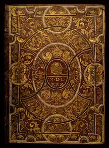 Les reliures aux plats de cartons sont encore couvertes de cuir, ou d’étoffes (principalement pour Charles V et le duc de Berry[71], jusqu'en 1536[72]). Certaines reliures de luxe sont à présent recouvertes de parchemin vélin blanc[73],[74], de veau[75],[76] ou, depuis peu, de maroquin[77],[78] : un cuir de chèvre utilisé en Italie, puis en France, qui se prête bien aux décors à l'or[72]. Le maroquin est d'ailleurs le cuir le plus utilisé sur les « reliures aldines », réalisées dans l'atelier d'Alde Manuce[72], mais aussi sur les reliures destinées à François Ier[79]. La feuille d'or se mêle aux estampages à froid, jusqu'à les remplacer totalement[72]. Les tranches des livres sont aussi fréquemment dorées, voire dorées-ciselées[72],[80]. C'est à cette fin que le « rognage » des tranches papier est inventé au début du XVIe siècle, et effectué à l'aide d'une petite presse à main et d'un fût à rogner[81].