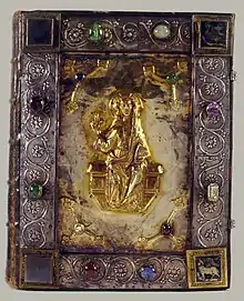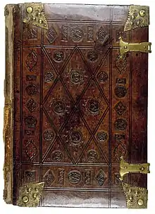 Les cuirs sont encore rarement utilisés[13]. Lorsque c'est le cas, la peau couvrant la reliure se trouve clouée à l'intérieur des ais (sans collage) et décorée dans un premier temps par des incisions de motifs[13], essentiellement des entrelacs et lignes diagonales[14]. Il s'agit le plus souvent de décors incrustés à même le bois[13] ou, pour les plus précieux exemplaires, d'incrustations d'ivoire et de pierres précieuses[3] (reliures d'orfèvrerie, aussi nommées reliures d'apparat[15]). Parfois, les plaques d'ivoire ou anciens diptyques sont réemployés et incrustés sur les plats de ces reliures[16],[17]. Il est cependant difficile de dater avec précision les premières utilisations de l'orfèvrerie sur les livres : le plus ancien exemple retrouvé daterait de l'an 326 (un évangéliaire offert par Constantin à Rome)[18].