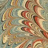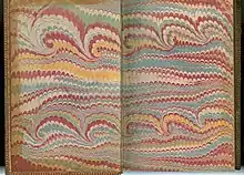 Les artisans cartiers et dominotiers fabriquent dès 1600 les premiers papiers marbrés décoratifs occidentaux[120]. Ils trouvent leur origine dans le suminagashi japonais, inventé au XIIe siècle[121], mais surtout dans les papiers turcs du XVe siècle, pour lesquels est utilisée une eau épaissie à la gomme adragante[120],[122]. C'est au relieur Macé Ruette qu'est attribuée la première utilisation de ce type de papier pour les gardes des reliures[120], d'abord uniquement contrecollé sur l'intérieur du plat, puis également en garde volante opposée, à partir de 1620[123]. Les motifs de ces papiers au XVIIe siècle sont généralement les « petits peignes[124] », puis, après 1670, les « feuilles de chêne[125] » et le « Old Dutch[126] »[123]. Les principales couleurs utilisées sont le rouge (en dominance), l'ocre jaune, le bleu et le vert[123]. Ces papiers comportent l'avantage d'être moins salissants que les gardes blanches, et cette mode se répand ainsi très rapidement[73],[120]. Pour les reliures de luxe, il devient d'usage que le relieur colle à l'intérieur du plat une doublure de cuir, qu'il peut orner de dorure[73] (une idée attribuée au relieur-doreur surnommé Le Gascon[127]). Les tranches des livres peuvent aussi être décorées, c'est-à-dire dorées (pour les reliures en maroquin uniquement[128]), peintes, jaspées[Note 8] ou marbrées de la même façon que les gardes[129].