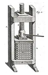 Les premières grandes presses de reliure, copiées sur le système du pressoir, apparaissent au cours du XVIe siècle.