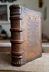 Volume I (ouvert) et Volume II (fermé) d'un exemplaire de la Bible de Gutenberg conservé à la Bibliothèque du Séminaire Duchownego à Pełpin, en Pologne.