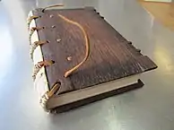 Pastiche d'une reliure gothique allemande du XIIIe siècle. À gauche, le passage des nerfs par-dessus les ais, puis à l'intérieur, puis vers l'extérieur, avant d'être sectionnés ; au centre, le blocage des lanières à l'intérieur des ais par des chevillettes ; à droite, la reliure couverte et estampée à froid. Elle comporte également deux bourrelets de cuir tissé.