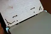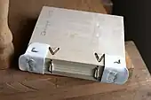 Maquette d'une reliure carolingienne à oreilles (IXe siècle), réalisée à la Bibliothèque nationale de France. À gauche, le passage des septains à l'intérieur des ais ; à droite : le passage des ficelles au contre-plat.