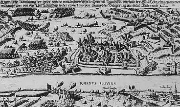 La porte de l'église possédait une fortification en demi-lune à deux branches. C'était une porte double avec deux maisons de gardiens, dont la première à proximité immédiate de la douve avec un pont. Ces deux maisons étaient attachées, chacune à un double mur. La porte des grains (Kornpforte) du côté Rhin avait également deux maisons de gardiens, l'une à l'arrière dans la perspective du mur, et la deuxième en tant qu'imposante fortification à l'avant, flanquée par les bretèches dans le mur vers l'ouest et vers l'est. Cette Kornpforte était l'accès principal à la ville, comme le montre la gravure de Matthäus Merian datant de 1646. La fortification bastionnée allait jusqu'au fleuve, qui, à l'époque, atteignit le mur d'enceinte, de façon à ne pas permettre un accès par le nord. La rive du Rhin jusqu'à l'ancienne grue dans l'ouest avait la fonction d'un port fluvial. Il est à souligner qu'il y a eu des changements importants au fil des siècles, notamment dans les zones près du Rhin.
