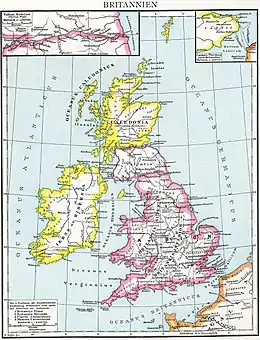 Au cours des Ve et VIe siècles, les peuples et les structures de pouvoir des îles Britanniques sont redistribués, avec des migrations de Bretons, de Scots, de Pictes et d'Anglo-Saxons[9]. Ainsi les îles « tout entiers rendus à la barbarie »[10].