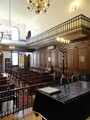 La salle de prière lambrissée au premier étage, montre l'influence des synagogues du Comtat Venaissin. De forme rectangulaire, elle comporte, sur trois de ses côtés, une galerie réservée aux femmes, en bois et protégée par une rambarde en fer forgé. Sur le mur est, l'Arche Sainte en bois est surmonté d'un fronton à base interrompue, reposant de chaque côté sur deux colonnes à chapiteau ionique et à fût cannelé, reposant sur un piédestal élevé. La Tevah située devant l'Arche sur un plancher en bois surélevé, est séparée du reste de la salle réservée aux hommes par une grille en fer forgé. Deux rangées de huit bancs en bois font face à l'Arche et à la Tevah. Sur les trois murs de la pièce, une rangée de sièges muraux en bois augmente la capacité d'accueil.