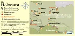 - Sources selon lesquelles 100 000 Juifs sont morts : Manus I. Midlarsky. The Killing Trap: genocide in the twentieth century, Cambridge University Press, 2005, (ISBN 0-521-81545-2) , p. 352. Martin Gilbert. Holocaust Journey: Traveling in Search of the Past, Columbia University Press, 1999, (ISBN 0-231-10965-2) , p. 219. Samuel Toten. Teaching About Genocide: Issues, Approaches, and Resources, Information Age Publishing, 2004, (ISBN 1-59311-074-X) , p. 25. Cara Camcastle. The More Moderate Side of Joseph De Maistre: Views on Political Liberty And Political Economy, McGill-Queen's Press, 2005, (ISBN 0-7735-2976-4) , p. 26 Colin Martin Tatz. With Intent to Destroy: Reflections on Genocide , Verso, 2003, (ISBN 1-85984-550-9) , p. 146. Mosheh Weiss. A Brief History of the Jewish People, Rowman & Littlefield, 2004, (ISBN 0-7425-4402-8) , p. 193.