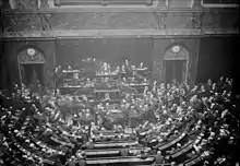 Incident de séance entre monarchistes et républicains lors de la séance du de la Chambre des députés qui siégeait à Versailles, dans la salle aujourd’hui affectée au Congrès (Le Libérateur du Territoire de Jules-Arsène Garnier)[2].