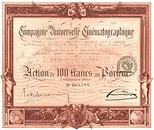 Et, le , les frères Lumière déposent en commun le brevet du Cinématographe avant de présenter, le , en projection privée sur un écran tendu dans l'échancrure d'une porte, à Paris à la Société d'encouragement pour l'industrie nationale, la Sortie de l'usine Lumière à Lyon. Après une tournée triomphale en France devant des spectateurs choisis, les frères Lumière se lancent dans la commercialisation de leur invention. Le , la première projection publique et payante de leurs films se déroule à Paris dans le salon indien du Grand Café, 14 Boulevard des Capucines. Au programme notamment l'Arroseur arrosé, le Repas de bébé, la Sortie de l'usine Lumière à Lyon. 35 spectateurs payants sont recensés le premier jour ; 35 francs de recette et 5 francs de bénéfice pour un loyer fixé à 30 francs, l'affaire est peu rentable. Mais après les articles élogieux de la presse parisienne, 2000 à 2500 spectateurs se pressent rapidement tous les jours ; le loyer reste fixé à 30 francs par jour pour une durée minimum d'un an, contrat oblige. L'affaire est commercialement très rentable[6].