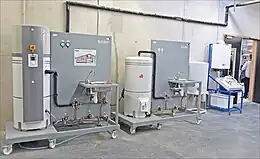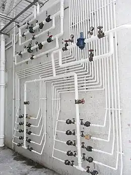 - Les hôpitaux avec les eaux froides brutes, les eaux traitées pour satisfaire la technique des appareils de soins toujours plus spécialisés, les réseaux d'eaux chaudes aux températures plus ou moins importantes, pour les besoins des chambres, cuisines et buanderies. Ce sont aussi les évacuations de ces eaux plus ou moins chargées de produits et matières polluantes diverses, qui doivent être traitées dans des stations ou des bacs de traitement, avant leur rejet dans les réseaux des égouts ou autres déversoirs[4].