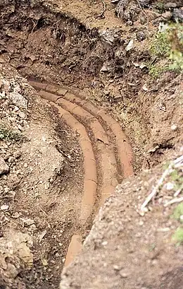 « Nous avons parlé jusqu'à maintenant d'un conduit creusé dans le calcaire. Cependant, ce n'est que le support pour la conduite, celle-ci reposant sur un lit de mortier de plâtre. Sur le pourtour cylindrique de cette couche de mortier, il y avait beaucoup de traces de vert-de-gris, parfois même de cristallin et enfin dans la partie d, 6 et e, 3, de plus gros morceaux de feuilles de cuivre oxydé... »
