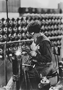 En 1881-87, les inventeurs Nikolaï Benardos (en), russe, et Stanislav Olchevski (en), polonais, ont créé la première méthode de soudage à l'arc électrique, anciennement connu sous le nom Elektrogefest, puis sous le nom soudage à l'électrode carbone de (CAW) en utilisant des électrodes de carbone[2],[3]. Les progrès de la soudure à l'arc ont continué avec l'invention des électrodes métalliques à la fin des années 1800 par un Russe, Nikolaï Slavianov (en) (1888), et un Américain, Charles Coffin (en) (1890). Vers 1900, A. P. Strohmenger a créé une électrode métallique revêtue en Grande-Bretagne, qui a donné un arc plus stable. En 1905, le scientifique russe Vladimir Mitkevich a proposé d'utiliser un arc électrique triphasé pour le soudage. En 1919, le courant alternatif de soudage a été inventé par C. J. Holslag , mais ne s'est pas développé avant la décennie suivante.