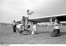 Le traité de Versailles interdisant toute forme de vol motorisé en Allemagne, de nombreux jeunes pilotes et concepteurs d'avions se sont tournés vers le vol à voile en tant que sport. Sous Oskar Ursinus (en)[14] et Theodore von Kármán, des amateurs et des groupes d'études universitaires sérieux ont commencé à construire des planeurs. Le premier concours a eu lieu en 1920 sur la Wasserkuppe. Parmi ceux qui se rassemblent sur la Wasserkuppe se trouvent des ingénieurs et des scientifiques ainsi que des amateurs et d'anciens pilotes de guerre désireux de trouver un moyen d'assouvir leur envie de voler. Certains des planeurs ont été modélisés d'après des avions à moteur, d'autres sont des hängegleiters des types Lilienthal et Chanute. Alors que de nombreux «vols» n'étaient que des trébuchements se terminant par un crash, Kármán et son équipe du RWTH Aachen avec leur planeur FVA-1 (de) Schwarzer Teufel (Diable noir)[15] sont les pionniers de la méthode de lancement à l'élastique et de vols réguliers de plus d'une minute suivis d'un atterrissage sans crash. L'événement a ensuite été répété chaque année avec une amélioration constante des planeurs et des résultats.