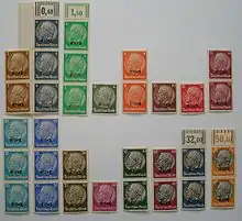 Le , soit moins de 2 mois après l'armistice, une première série de timbres allemands à l'effigie du maréchal Hindenburg furent surchargés Elsass pour une utilisation en Alsace[1]. Ils furent retirés de la circulation le .