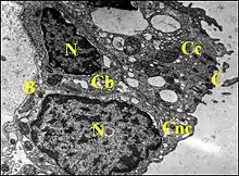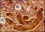 Elle est constituée, sur le plan histologique, par un réseau dense de capillaires sanguins sinusoïdes à paroi mince que souligne l'actine musculaire lisse de sa composante contractile, et par des amas cellulaires arrondis (« Zellballen ») de structure glomérulaire ou alvéolaire. Leurs cellules ont un noyau vésiculeux arrondi, à nucléole très apparent, et un cytoplasme granuleux clair ou éosinophile. La dénomination usitée est celle de paragangliome, définissant la tumeur qui se développe aux dépens des paraganglions (Zellballen ou cluster).